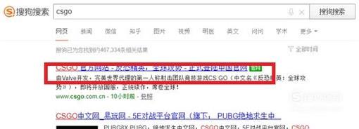 首先,使用搜狗搜索“csgo”,在首页选择带有官网字样的网址,进入csgo官网。