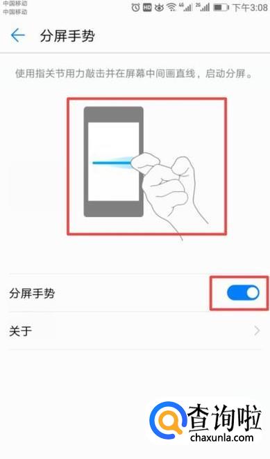 然后我们将分屏手势开启,然后我们敲击屏幕,并在中间画直线就可以开启分屏了。还是比较容易的。相信大家都已经学会了。