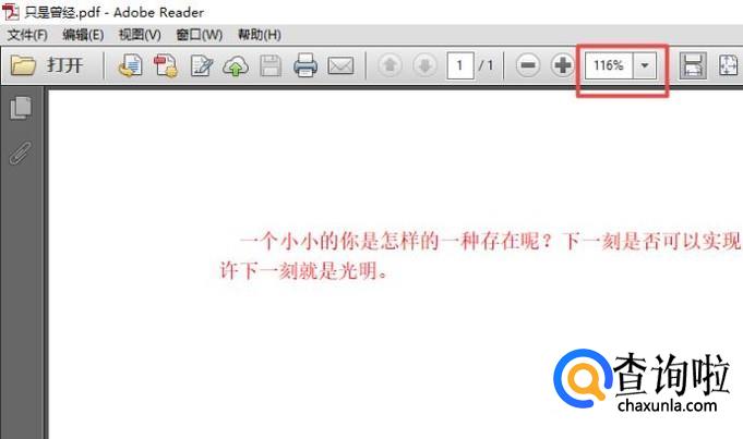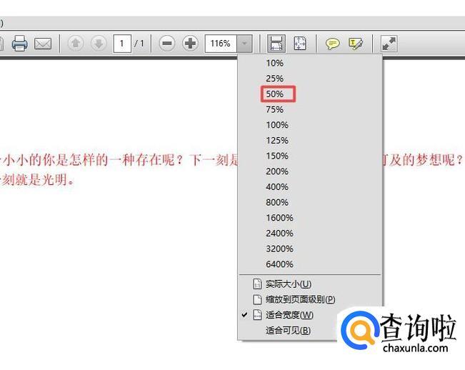 进入该PDF文档之后,我们看到此时默认的大小是116%,我们点击边上的下拉箭头;