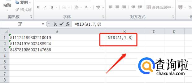 然后在图示的单元格输入=MID(A1,7,8),A1为身份证号的坐标,7为从第7位数字提了起,8为提取8个连续数字。