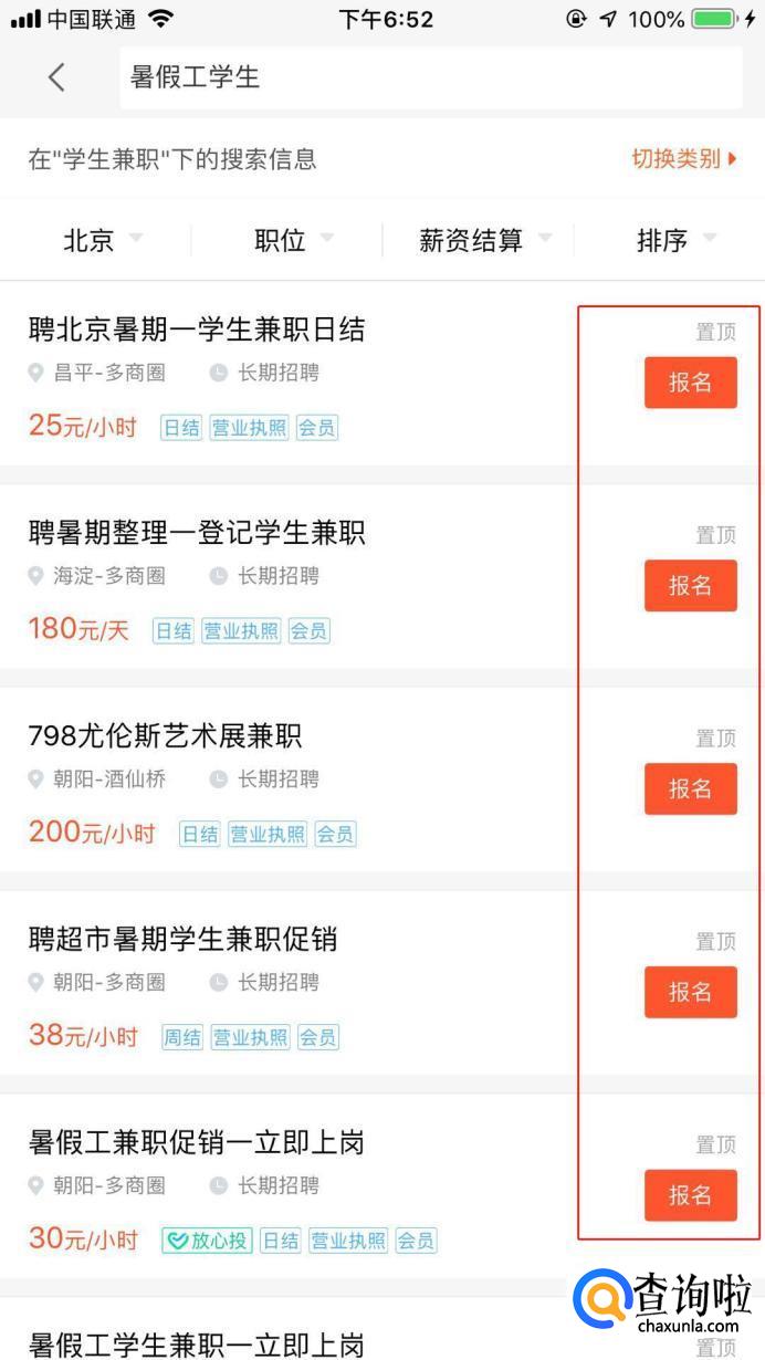 搜索以后,我们可以看到页面下方出现了很多的招聘信息,可以选择你想要干的工作,选择后面的“报名”就可以联系招聘人进行沟通。