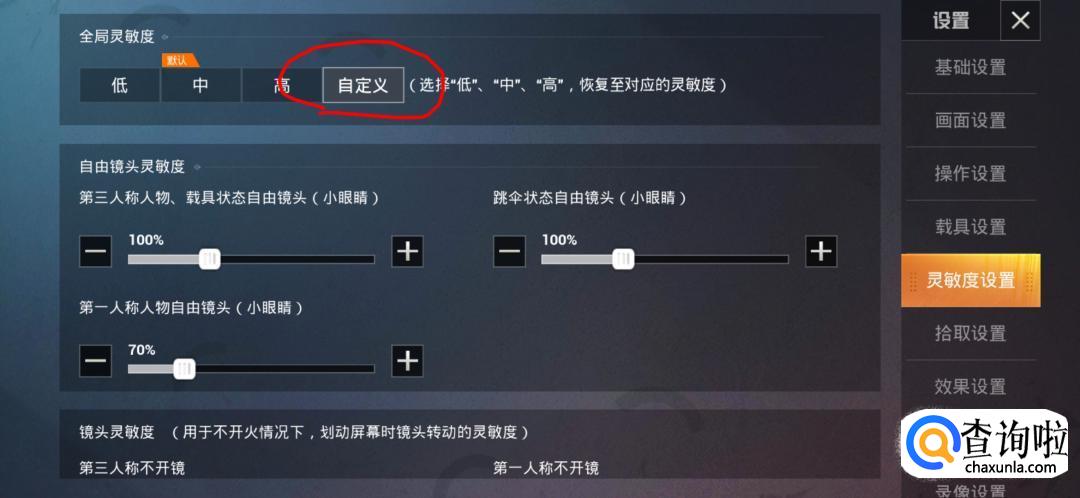 登陆和平精英,在主页面点击设置图标,选择灵敏度设置,选择自定义灵敏度,如下图所示。