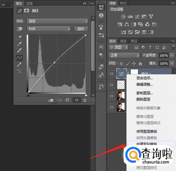 调整【曲线】--【创建剪贴蒙版】,可调整图层的明暗程度;反复操作。