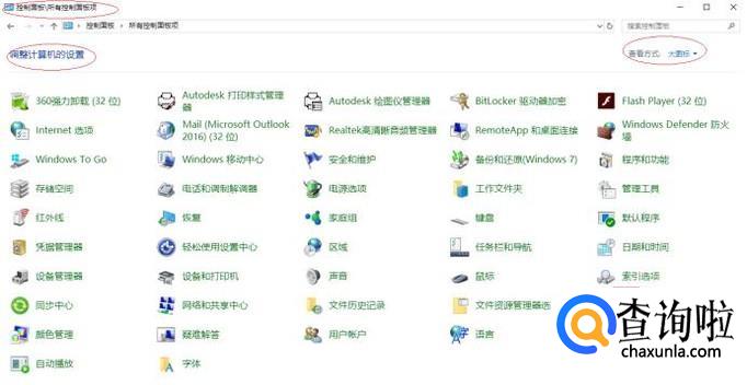 唤出"控制面板"程序窗口,如图所示。点击上侧"查看方式"文本框向下箭头,弹出下拉列表选择"大图标"项。