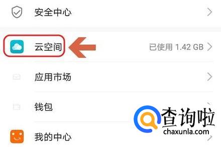 点击进入到账号中心,然后在页面的中间位置找到“云空间”这一项,如图所示...