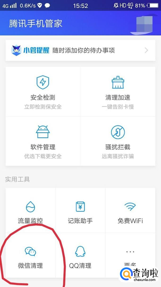 首先打开手机管家,因为我们的垃圾文件大部分来源于微信和QQ,所以首先点击微信清理。