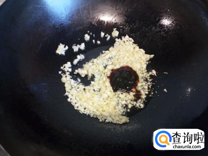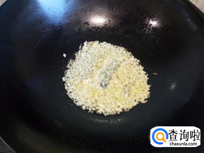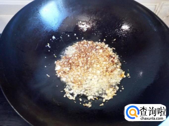 锅内放入油加热(油不要太多),油热后放入蒜末,小火翻炒。不要炒糊,炒出蒜香味即可。