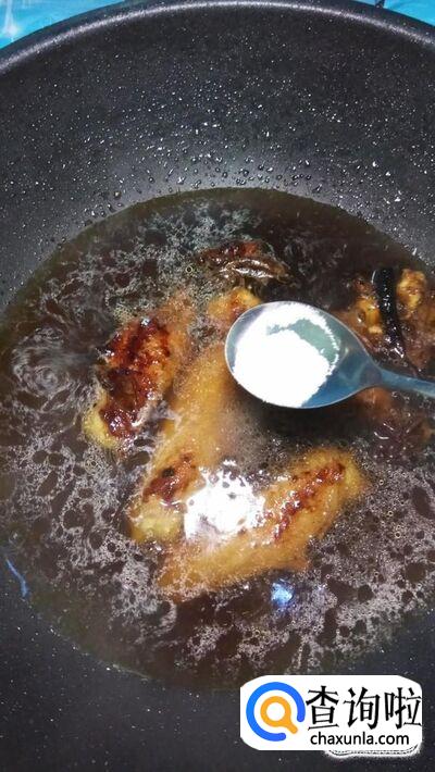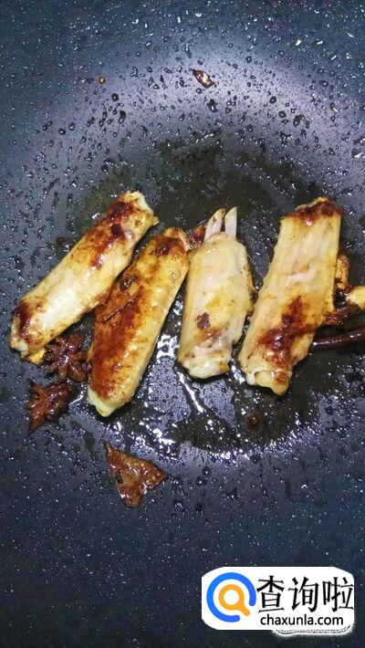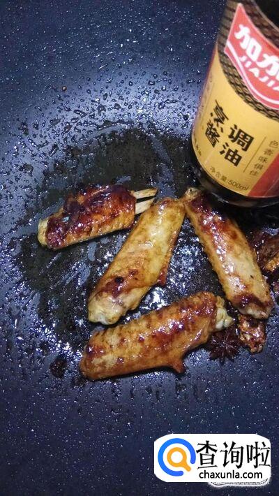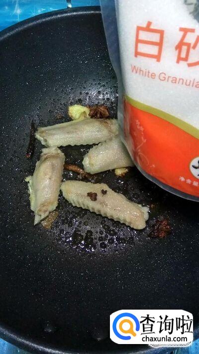 放入适量白砂糖,炒出糖色,鸭翅很快就裹上一层糖色,加入适量老抽,让鸭翅的颜色更加好看。