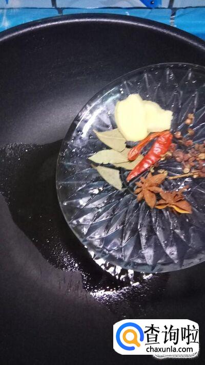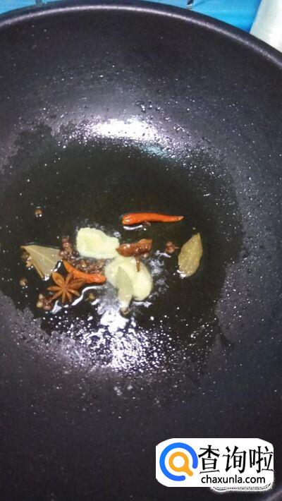 锅中放入适量油,油热后,放入适量花椒,八角,干辣椒,生姜爆香。