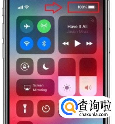 在滑出的控制中心右上角,我们就可以看到电池电量的百分比了,如图所示: