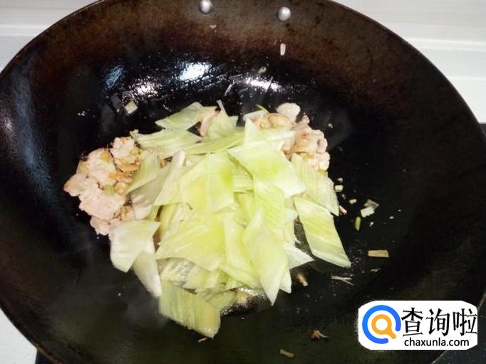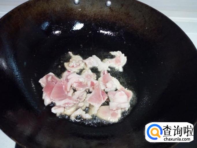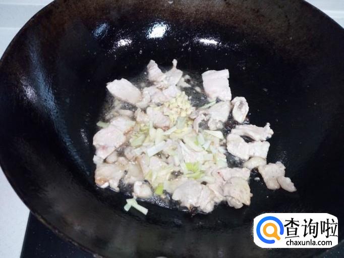 炒至肉片变软,颜色微白,放入葱,姜,蒜,翻炒,放入料酒,少许酱油。