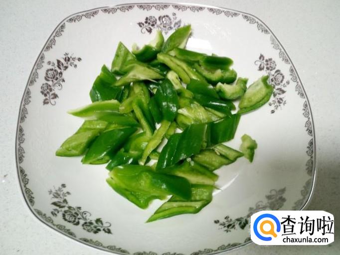 青椒用水清洗干净,控干水分,切成菱形片。