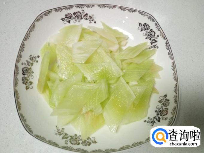 莴笋去皮,用水清洗干净,控干水分,切成菱形薄片。