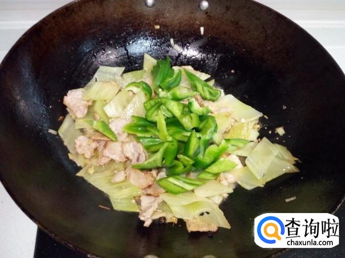 然后放入莴笋,放入醋(醋可以保持莴笋脆感,同时还有酸香的味道,根据个人喜好掌握放醋的量)快速翻炒至断生,放入青椒,放入盐。