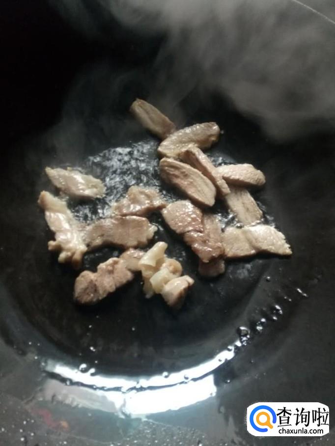 锅热放油,油热以后,放入肉片,炒两下。
