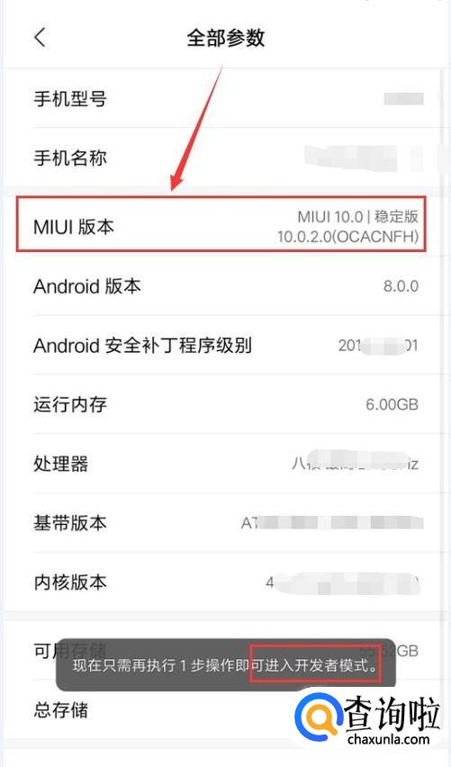 在全部参数界面,连续点击“MIUI版本”,就会进入到开发者模式。