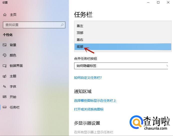 接着选择“任务栏”按钮下的“靠底”。