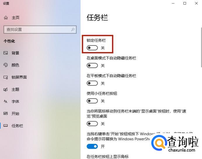 首先把“锁定任务栏”的开关关闭。