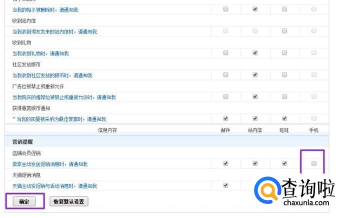 弹出的界面,在最下方我们可以找到营销提醒,我们需要将手机的那两个勾选取消掉,然后点击确定,以后就不会收到短信提醒了。