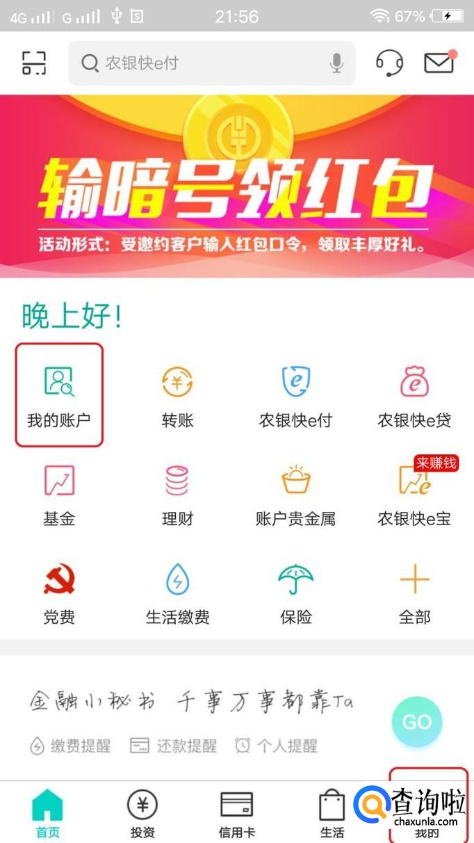 然后,我们在手机银行首页点击“我的账户”,或者右下角“我的”,登录手机银行。