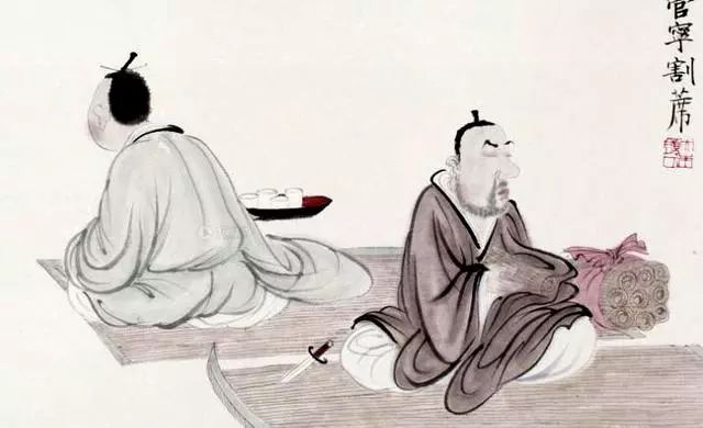 曾经他们同坐在同一张席子上读书,有个坐着有围棚的车穿着礼服的人刚好从门前经过,管宁还像原来一样读书,华歆却放下书出去观看。管宁就割断席子和华歆分开坐,说:“你不是我的朋友了。”通过管宁、华歆二人在锄菜见金、见轩冕过门时的不同表现,显显出二人德行之高下。