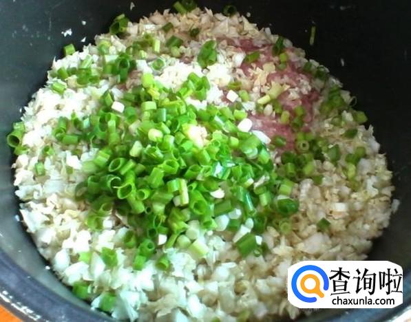 将五花肉剁成肉末,姜蒜切成末,白菜剁碎,粉条煮好后剁碎,放入盆中,加入十三香、酱油、白糖、一块豆腐乳和少许腐乳汤汁,搅拌均匀,放在一旁。