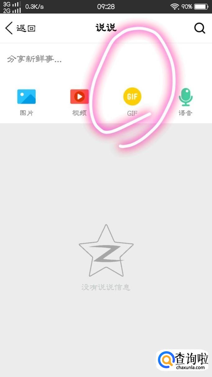 最后,大家点击以后就会进入一个页面,可以发说说,也可以查看自己发过的说说,我们这时点击屏幕中上方的“GIF”并点击自己需要上传的动态图,即可