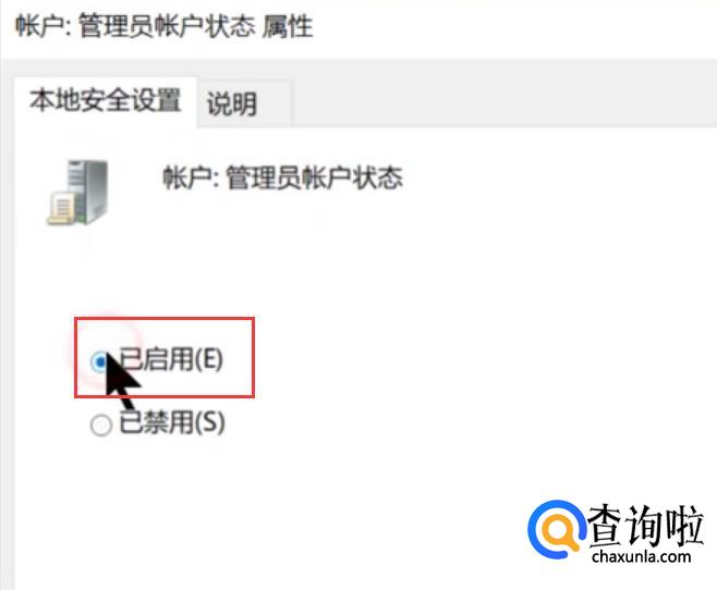 在本地安全设置里面打开“已启用”,点击应用并点击确定。