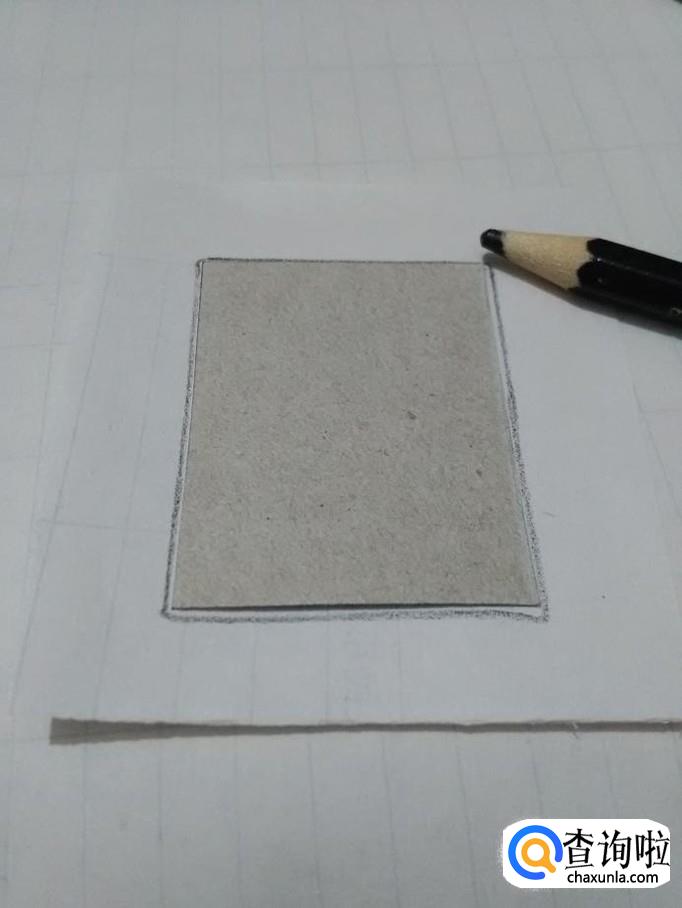 先把邮票大小的长方形纸板按在纸上,用笔沿着长方形的边缘,在纸上画出一个长方形。