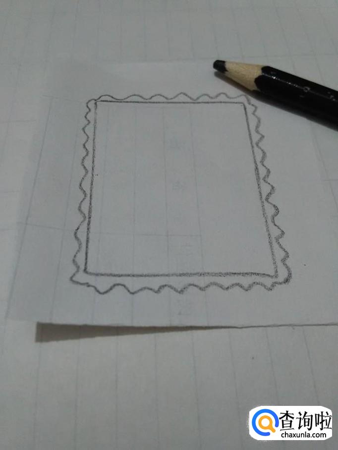 把纸板拿开后,在长方形的外侧画四条波浪形曲线,表示邮票的锯齿。