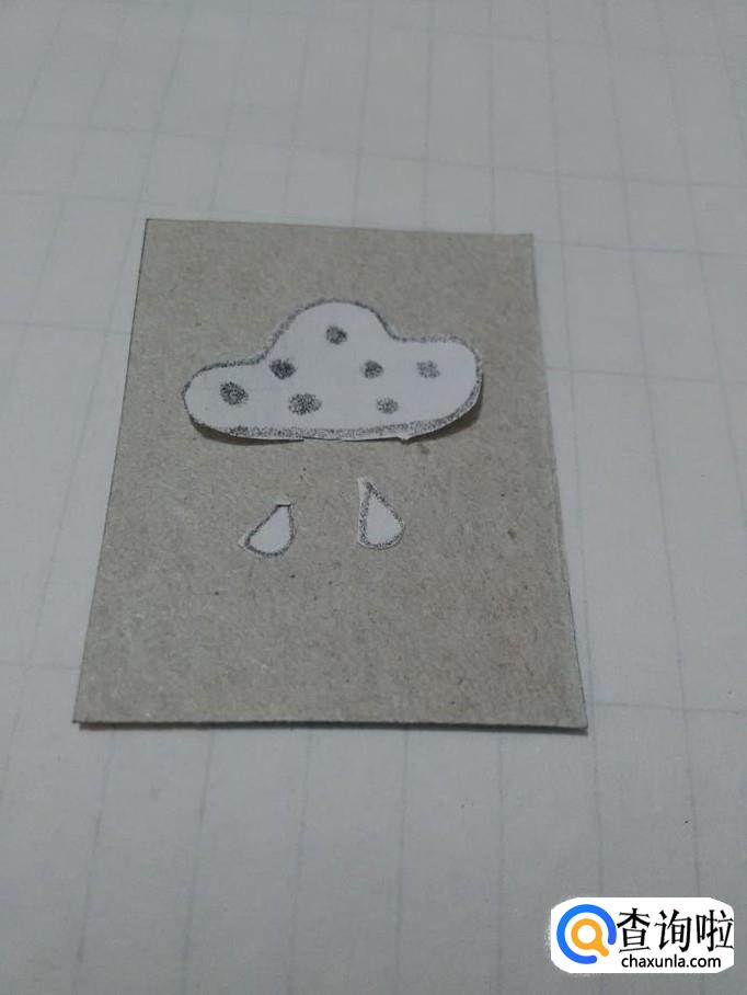 用剪刀将云朵和小水滴剪下来,然后在云朵和水滴背面抹上胶棒,粘在灰色的硬纸板上。