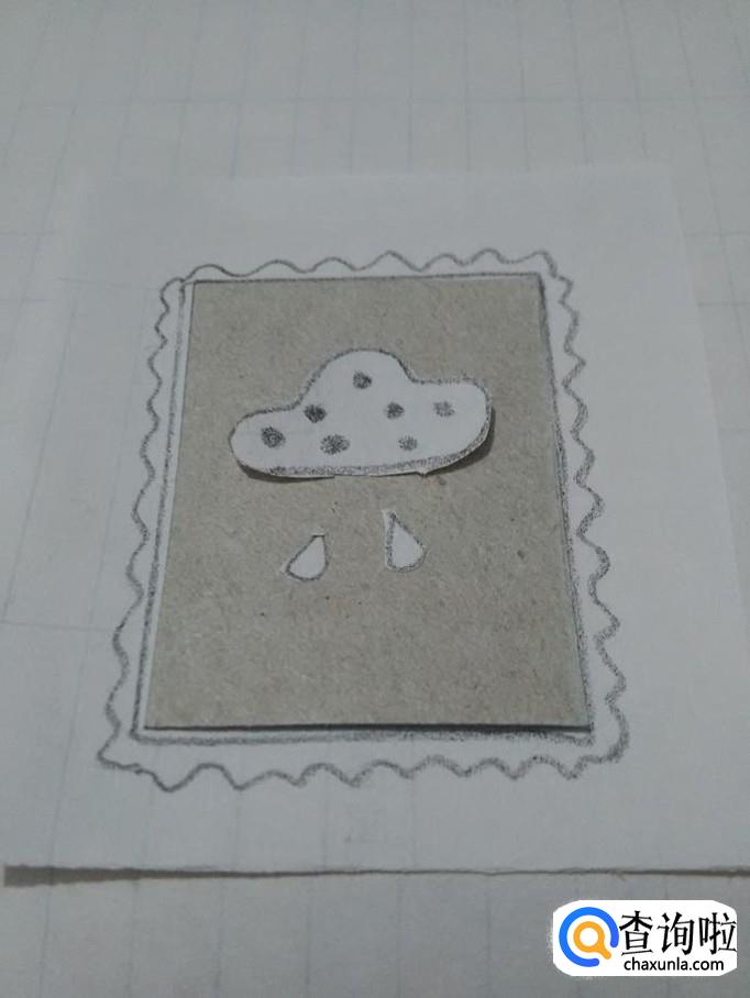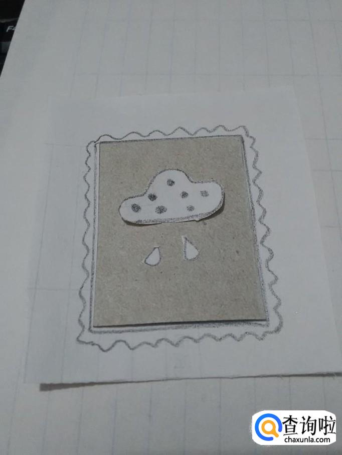 再将硬纸板背面抹上胶棒,粘在画好的邮票方框内,一枚卡通拼贴波点云朵邮票就做完了。