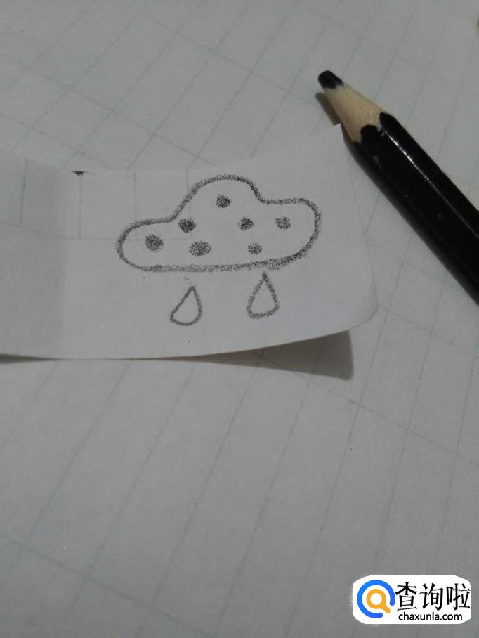 用黑笔在纸上画三条相连的弧线,表示云朵,在云朵下面画两个小水滴的形状,在云朵里面画几个黑色的圆点。