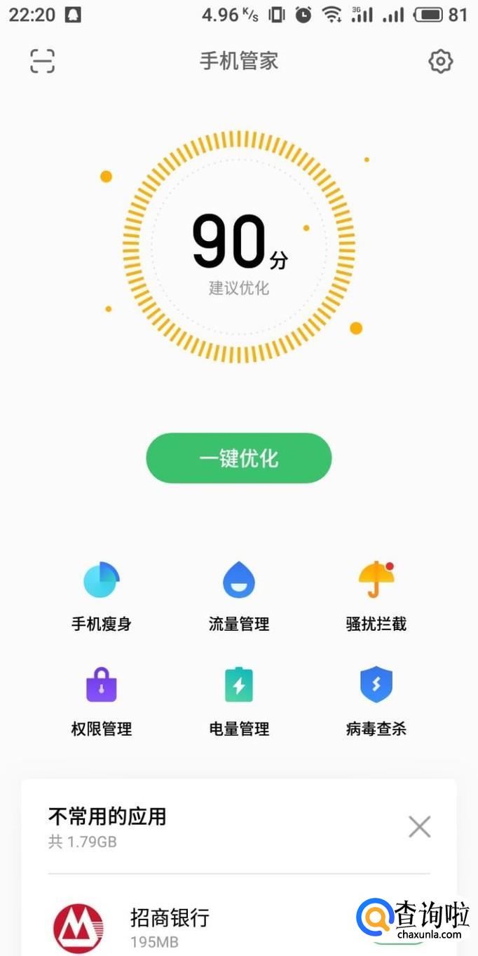进入手机管家管家界面,等待应用刷新手机分数,点击“一键优化”