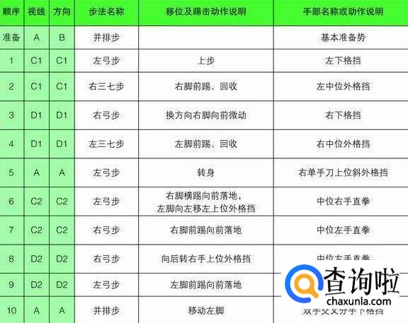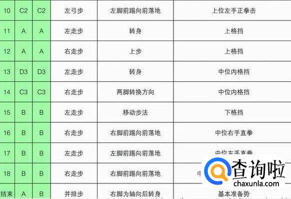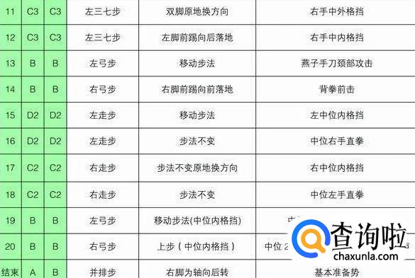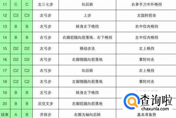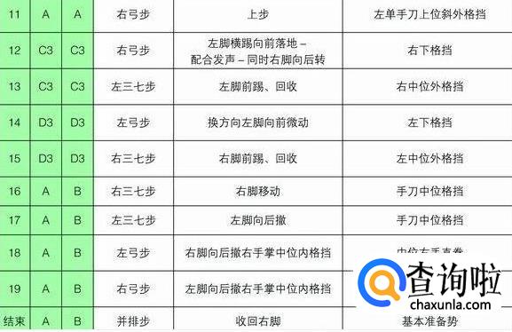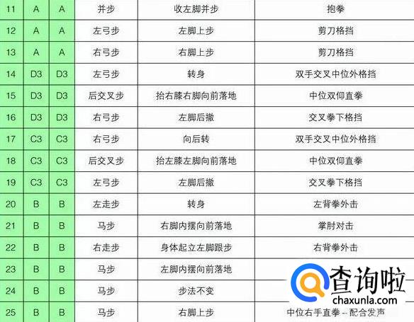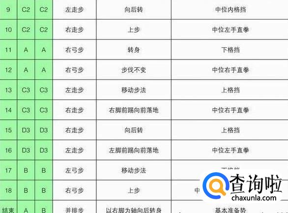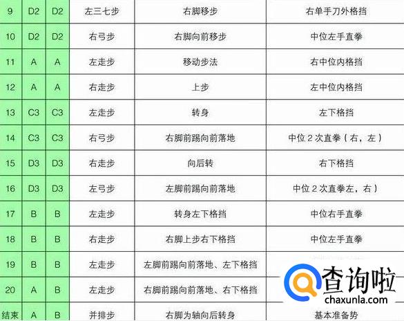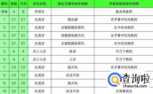 注意事项:要求虎步做得规范准确。手掌中内格挡后,背拳前击的高度是人中,手脚要同时进行,剪刀手格挡时要连续进行,要利用腰部的力量。动作21~22的内摆与掌肘对击的动作要同步进行,掌肘对击的高度是胸口。背拳外击时起始动作肩部开始,拳心向脸部。