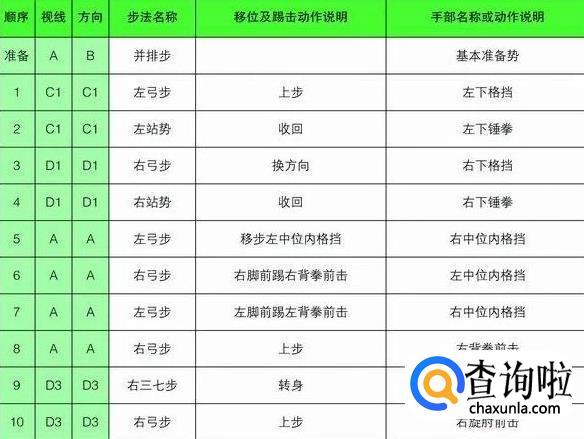 注意事项:下锤拳时,击打的拳要从辅助拳内侧向外击打。中内格挡和背拳前击时,双拳的高度要明显。侧踢与侧击后,掌肘对击要同步进行。