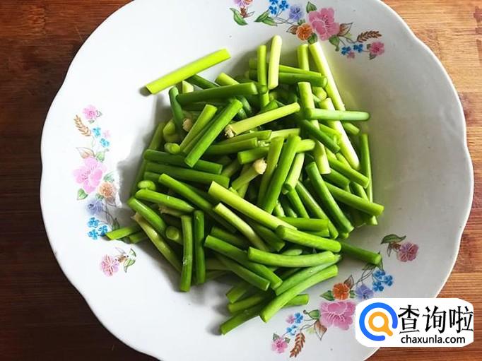 蒜苔洗净切成如下的段备用。有蒜苔就不用放葱了,因它们都是辣的,放多了就影响口感。