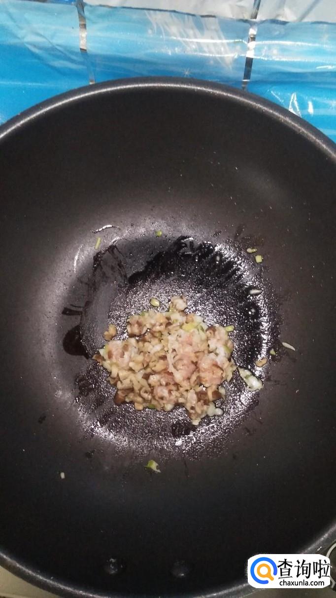 炒锅中放入适量油,油热后放入葱末,蒜末,姜末炒香,然后将腌好的肉末,腌好的肉末香菇末,放入放入锅中炒香,锅中炒一下,可以加少许生抽提鲜。