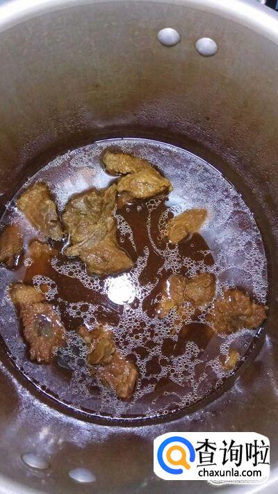 将做好的料汁儿倒入高压锅中,料汁一定要没过排骨,再放入适量盐,盖上高压锅的盖子,大火烧开,转小火,压上18分钟。