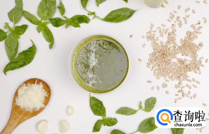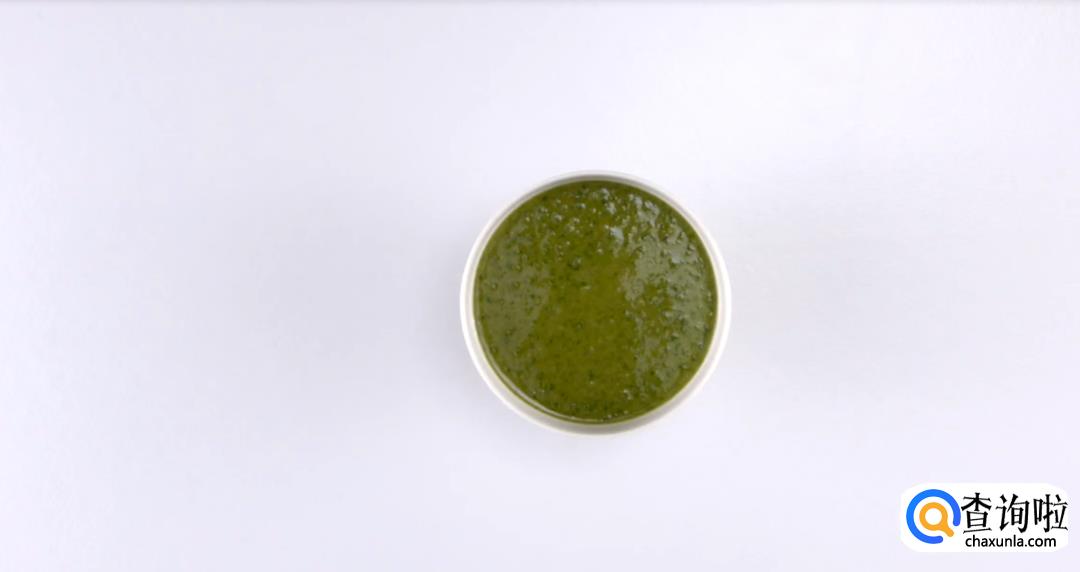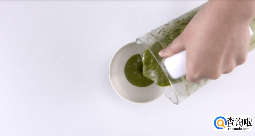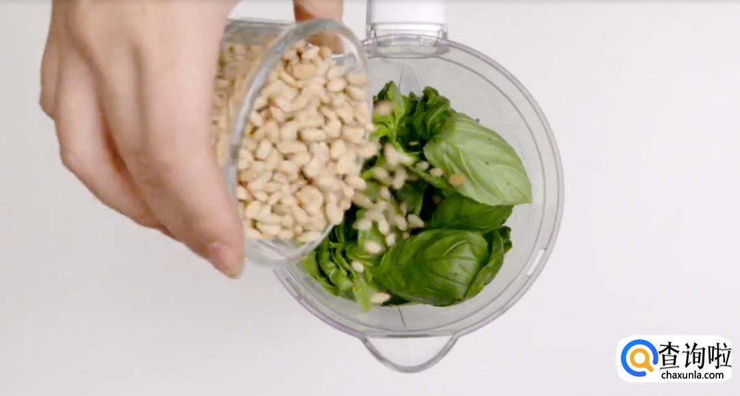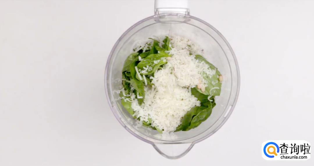 放入松子,倒入适量意大利干奶酪,打碎搅拌均匀。