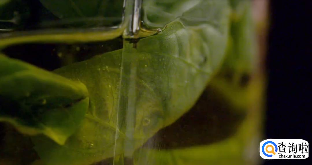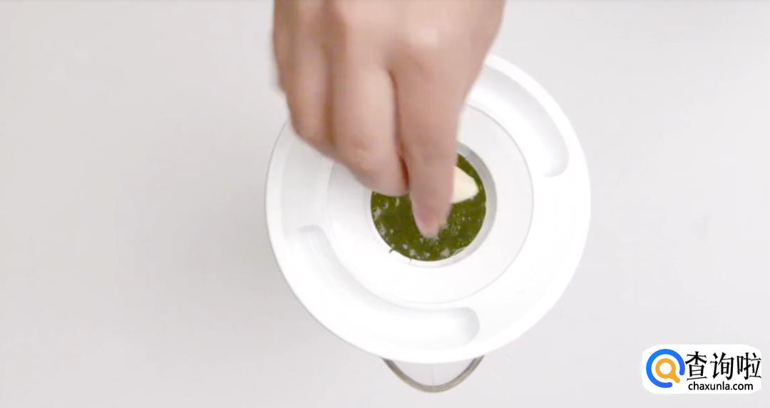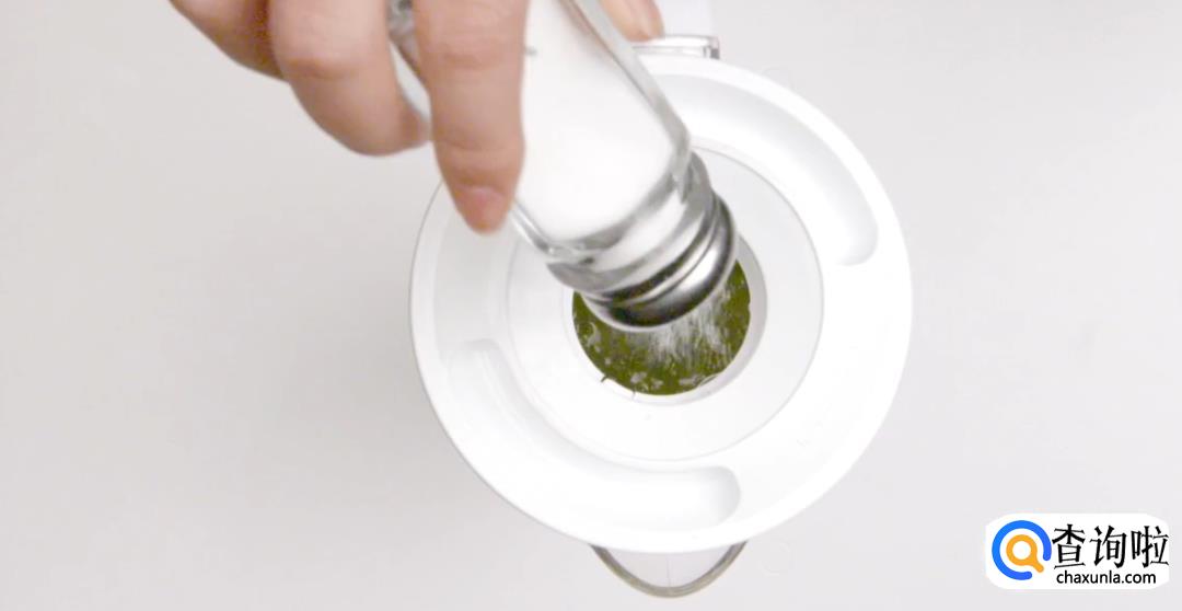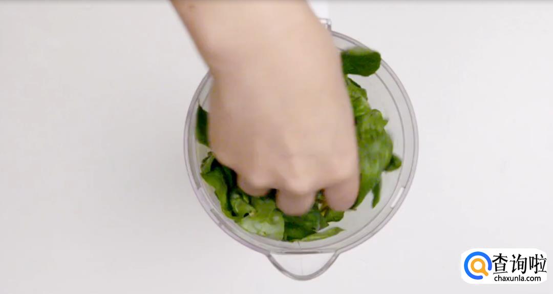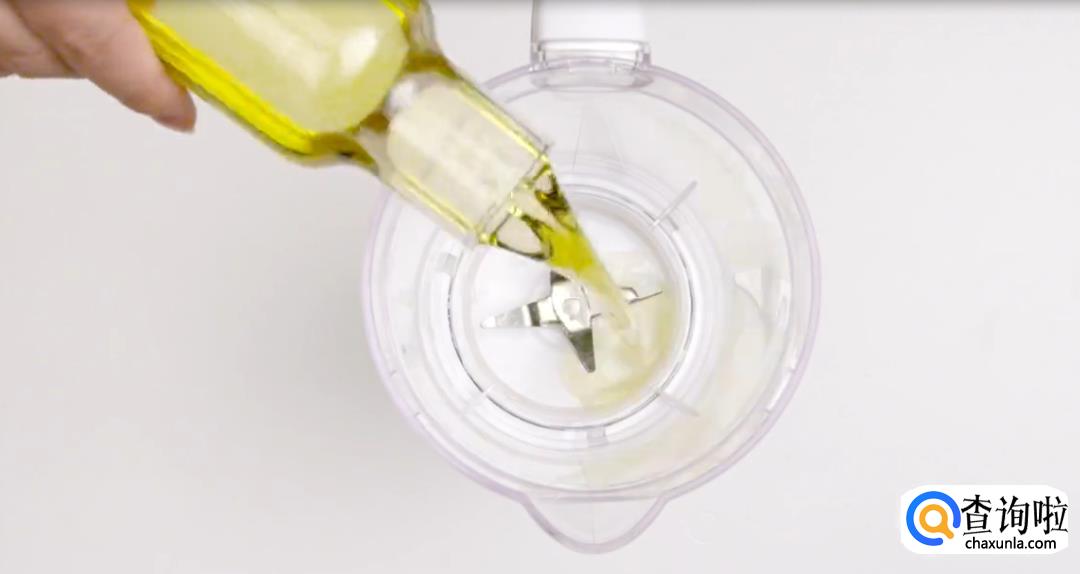 将橄榄油倒入料理机,放入新鲜的罗勒。