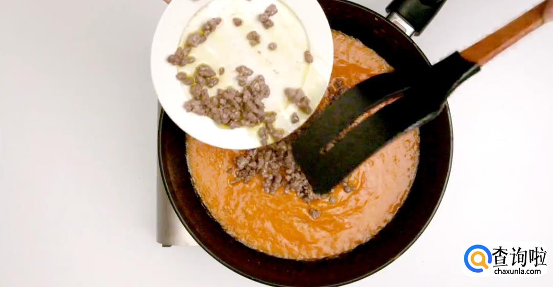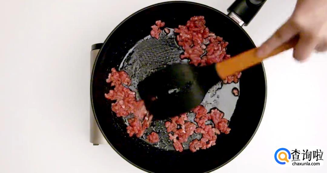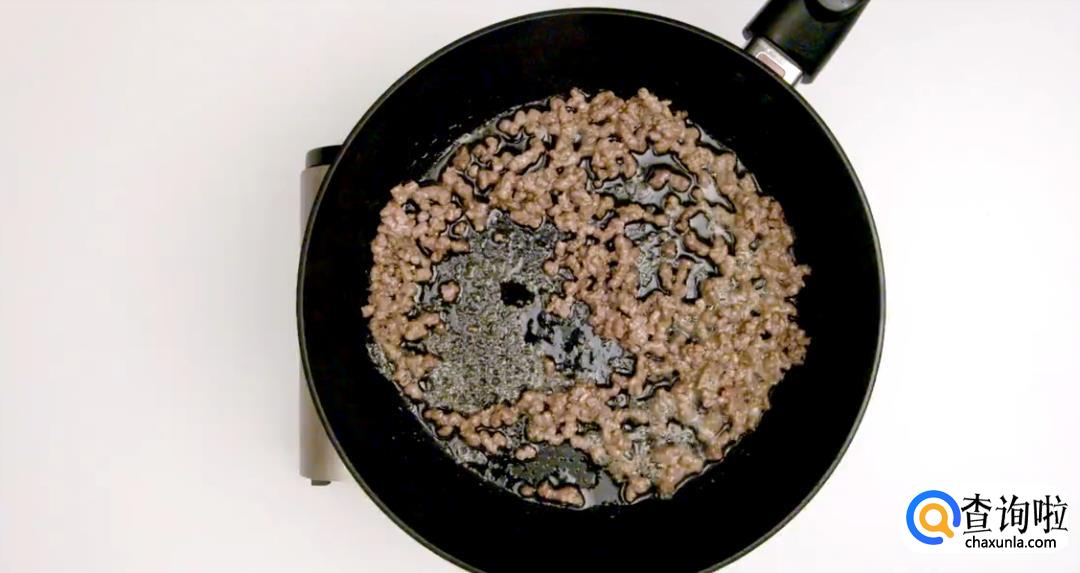 热锅起油,放入牛肉糜翻炒。翻炒至肉糜变色出油,关火盛出待用。