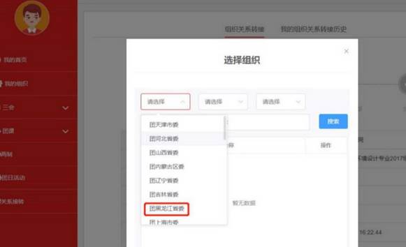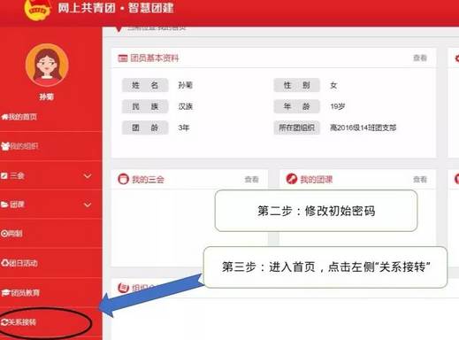 点击登录“智慧团建”登录号码为团员身份证号码,密码为身份证后八位。点击左侧“业务办理”然后点击“组织关系转接”,填写个人信息,逐级查找“申请转入组织”即可提交团组织关系转接申请。地址填写完成后,申请转入组织。