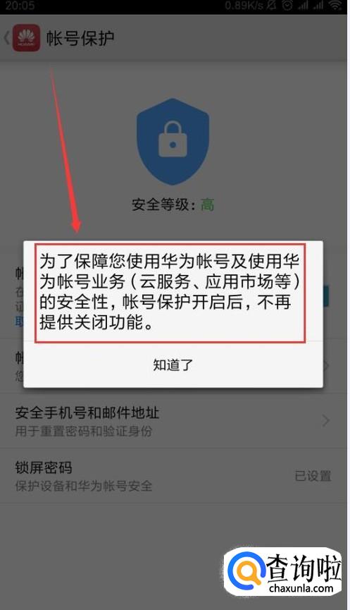 然后在窗口中会有提醒:“为了保障您使用华为账号及使用华为账号业务(云服务、应用市场等)的安全性,账号保护开启后,不再提供关闭功能”,我们得知,这个功能一旦开启是无法关闭的。