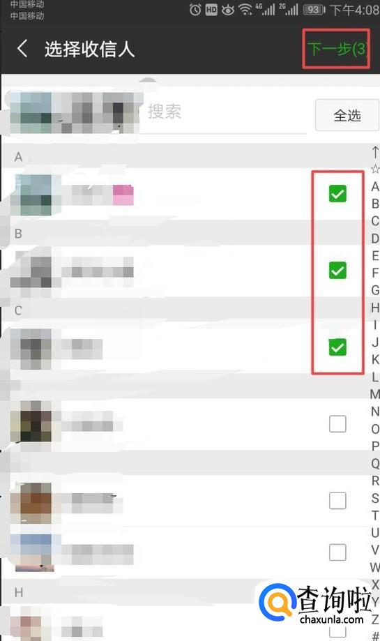 弹出的界面,我们选中我们想要群发的人员,然后我们点击下一步;