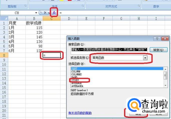 单击一个空单元格(指定标准偏差值输出位置),点击图中的“fx”按钮,调出“插入函数”选项框,在常用函数下面找到“STDEV函数”,点击一下,并确定。