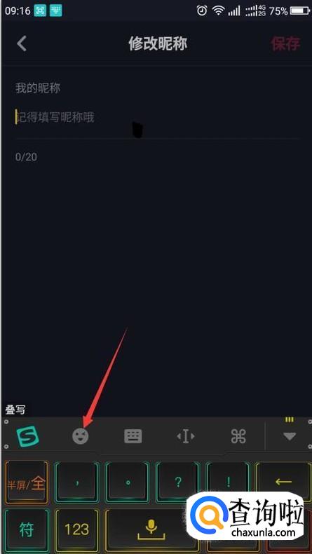 删除原来的呢称文字,再点击下方的表情按钮。再点击颜文字。