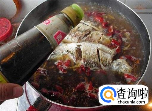 然后再放入鲫鱼,并倒入适量的清水、料酒、老抽和盐等调味料,开始煮制。