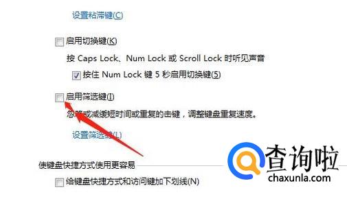 进入使键盘更易于使用界面后,将启用筛选键的勾勾除就可以了,如图所示。