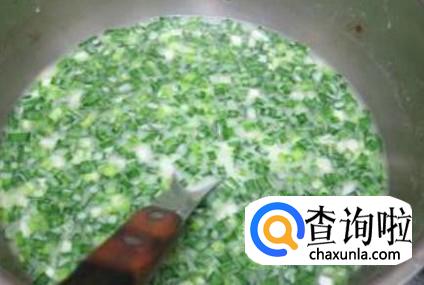把粘米粉和木薯淀粉放至盘子【粘米粉和木薯淀粉的比例是4-7】再加入适量的盐、切好的韭菜,然后加水,水和食材的比例是1-1,搅拌均匀。